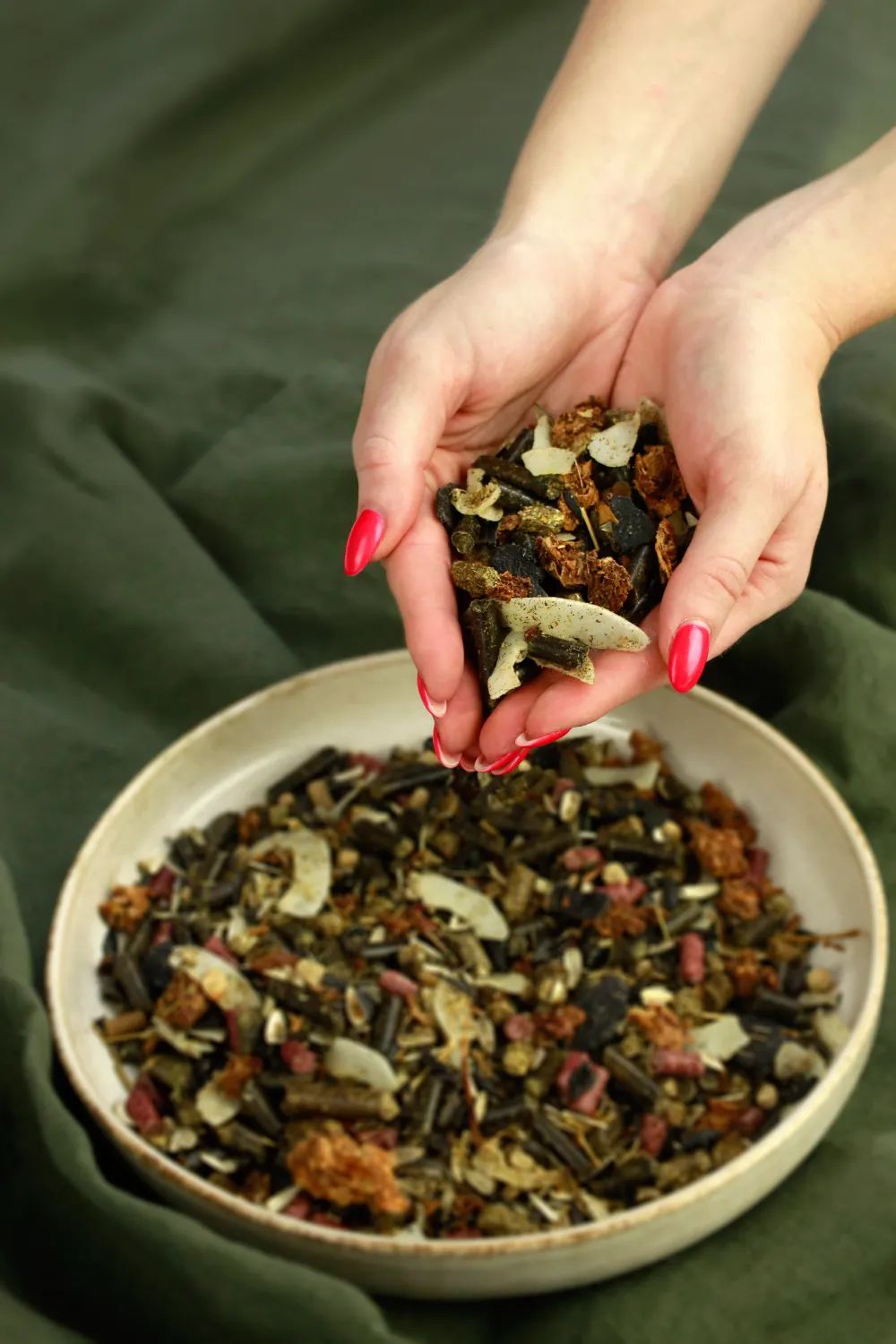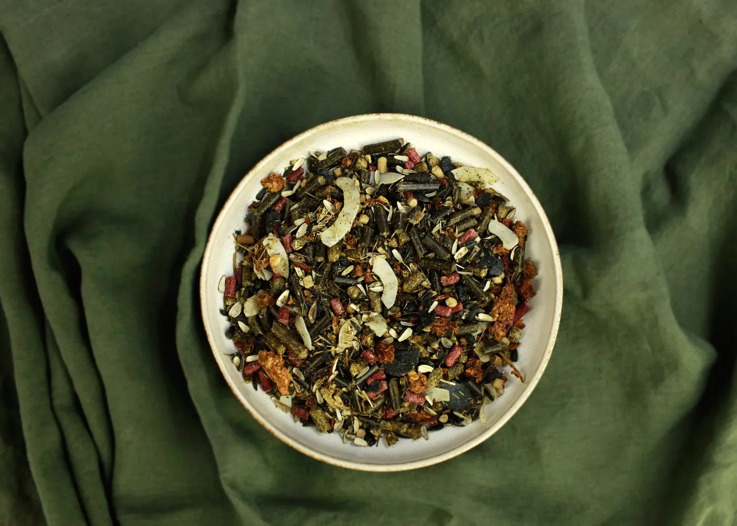 Susz z traw, susz z lucerny granulowany, granulat Grassland Everyday Care, makuch z czarnuszki, otręby ryżowe, łuska słonecznika, wytłoki jabłkowe, kokos płatki, olej lniany, rumianek ziele, ostropest ziarno, koper włoski ziarno, chlorek sodu.