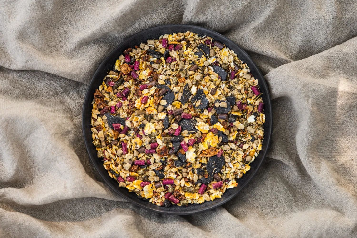 Kukurydza mikronizowana, granulat Grassland Everyday Care, jęczmień mikronizowany, słód jęczmienny, makuch z czarnuszki, makuch lniany, wytłoki jabłkowe, otręby ryżowe, olej lniany, granulowany susz z lucerny, melisa ziele, rumianek ziele, chlorek sodu.