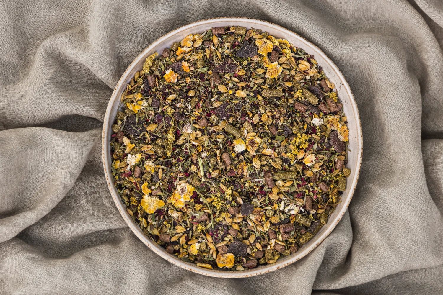 Susz z lucerny granulowany, makuch lniany, makuch z czarnuszki, wytłoki z aronii, wytłoki z porzeczki, jęczmień mikronizowany, kukurydza mikronizowana, słód jęczmienny, koper włoski nasiono, babka lancetowata liść, anyż ziarno, czystek ziele, mięta ziele, tymianek ziele, podbiał liść, jeżówka purpurowa ziele, pokrzywa ziele, kwiat czarnego bzu, eukaliptus liście, igły świerku, prawoślaz korzeń, oregano.